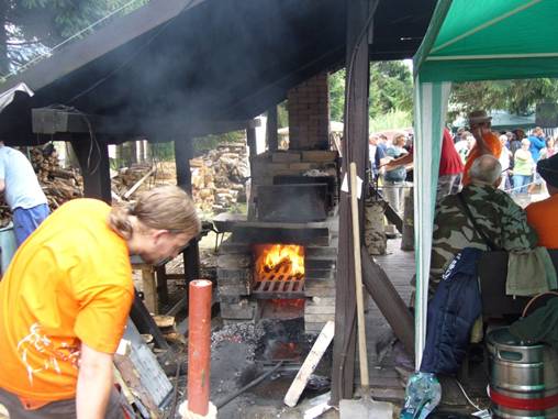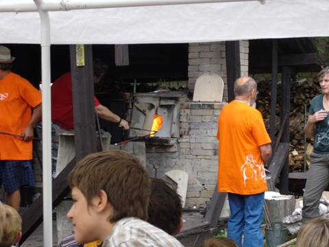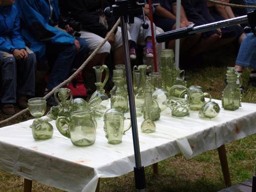 XX. ročník tavení skla dřevem. Výrobky sklářů z nazelenalého lesního skla se na konci akce draží.