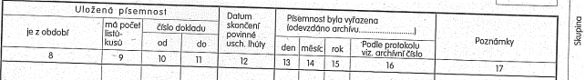 (2) Před uložením písemnosti na sekretariát se z ní vyřadí přebytečná vyhotovení, kopie a pomocné poznámky. Písemnost se připraví tak, aby byla úplná, přehledně uspořádaná a na štítku řádně označená názvem sdružení, názvem (druhem) písemnosti, časovým rozsahem, skartačním znakem, ukládací lhůtou a rokem, v němž ukládací lhůta uplyne.