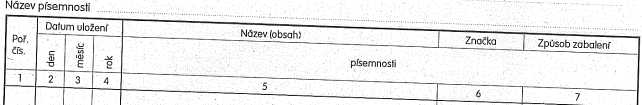 (2) Před uložením písemnosti na sekretariát se z ní vyřadí přebytečná vyhotovení, kopie a pomocné poznámky. Písemnost se připraví tak, aby byla úplná, přehledně uspořádaná a na štítku řádně označená názvem sdružení, názvem (druhem) písemnosti, časovým rozsahem, skartačním znakem, ukládací lhůtou a rokem, v němž ukládací lhůta uplyne.